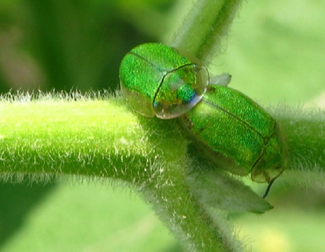 La prepupa se observa después de que el estadio larval vi alcanza su máxima dimensión, tiene una duración aproximada de 12 h. En este lapso dejan de alimentarse y se vuelven solitarias, buscando un lugar con poca incidencia de luz para fijarse. La pupa tiene una duración de 6-7 días (fig. 3A, B), la última muda es retenida en los últimos segmentos abdominales. El adulto recién emergido es de color amarillento con los élitros traslucidos y suaves (fig. 3C). El tiempo en que los adultos tardan para alcanzar la coloración verde metálica es de 10-15 días; sin embargo, pueden tardar hasta 40 y 70 días (Gutiérrez-Díaz, 1981).