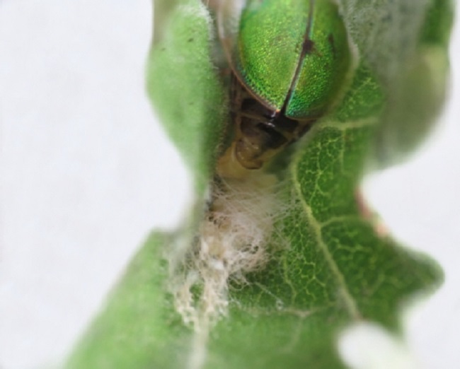 Los adultos de E. ovata (figs. 3C y 4) inician su actividad a fínales del mes de mayo junto con las primeras lluvias de la temporada, concluyendo a principios de noviembre. La puesta de huevos sobre la planta huésped M. tomentosa corresponde al intervalo entre los primeros días de junio y principios de octubre. En cautiverio, después de cópulas sucesivas se contabilizaron hasta 3 puestas por hembra en periodos de entre 3 y 6 días. Para la puesta la hembra selecciona una hoja vigorosa. Se posiciona en dirección contraria al ápice de la hoja sobre la nervadura principal y coloca los huevos en el envés de la hoja. Del ovipositor se secreta una sustancia viscosa en forma de hilo. La hembra selecciona 2 puntos en la superficie de la hoja y comienza a construir un tipo de red. Mediante movimientos laterales con el ovipositor coloca dicha sustancia sobre la superficie del envés de la hoja. Posteriormente deposita de 2-4 huevos los cuales son cubiertos por la sustancia secretada, y repite el proceso hasta colocar de 25-35 huevos (fig. 5). Al entrar en contacto con el aire la sustancia secretada se contrae y se torna fibrosa, lo que ocasiona que la hoja tome forma de cono. Los huevos quedan en hilera dentro del cono. El proceso de oviposición tarda aproximadamente 60 min y el proceso de incubación tiene una duración de 9-10 días. Después de la eclosión E. ovata pasa por 6 estadios larvales. El ciclo completo tiene una duración promedio de 22 días.