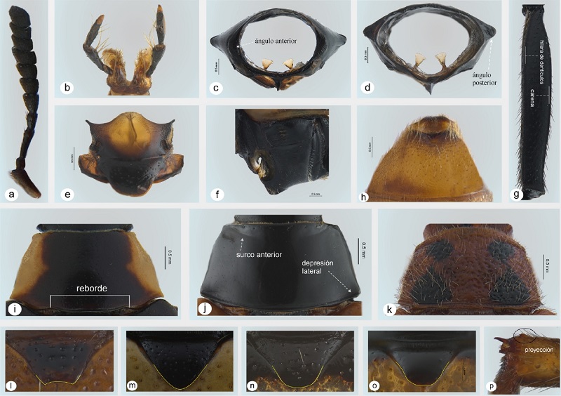 Redescripción. Cabeza. Ancha, constreñida por detrás de los ojos; espacio interocular con puntos ocelados gruesos en el margen interno de los ojos; margen superior de la inserción antenal elevada. Antenas casi clavadas, cortas, no sobrepasando el margen posterior del pronoto, de 11 antenómeros, primer antenómero más corto que el tercero, primer antenómero al cuarto subcónicos, del quinto al décimo más anchos que largos, articulados en la parte externa, el undécimo ovoide, revestimiento del primero al cuarto antenómeros con setas esparcidas, del quinto al onceavo opacos con setas decumbentes (fig. 1a). Ojos prominentes, margen interno emarginado, sin impresiones y glabro. Surco frontoclipeal amplio y profundo. Clípeo trapezoidal, ápice translúcido. Labro semicircular, convexo, con márgenes fuertemente pubescentes, ápice achatado. Mandíbulas triangulares, con un surco lateral punteado. Palpos maxilares con 4 palpómeros, el primero subcónico y más largo que el resto, el segundo más corto que el tercero, el último subcónico, con el ápice agudo; lígula bilobada (fig. 1b). Palpos labiales con 3 palpómeros, primero más corto que el resto, el segundo en forma de clava y muy largo, el tercero fusiforme. Gula punteada. Tórax. Pronoto más ancho que largo, porción posterior más ancha que la anterior; ángulos anteriores (fig. 1c) y posteriores proyectados (fig. 1d), borde posterior con un reborde. Cavidades procoxales cerradas; procoxas contiguas, cónicas y sobresalientes; mesocoxas ovadas ligeramente sobresalientes; metacoxas subcuadradas, poco separadas. Mesonoto con órgano estridulatorio (fig. 1e). Escutelo triangular. Élitros subparalelos lateralmente, dorsalmente convexos y punteados irregularmente, húmeros prominentes, proyectados anterolateralmente, ápices redondeados. Proceso mesoventral y metaventral unidos entre las mesocoxas, con un pequeño orificio en la parte basal (fig. 1f). Metaesterno con una proyección cónica media (fig. 1f), línea metatorácica presente. Metaepisterno excavado en la región basal. Patas aumentando de tamaño del primer al último par; metafémur más robusto que el profémur y el mesofémur; tibias dorsalmente con una hilera de dentículos (fig. 1g), ápice con 2 espolones; mesotibias y metatibias curvadas, metatibias ventralmente llanas y glabras en los machos, hembras con las metatibias subcilíndricas con setas erectas; los 3 primeros tarsómeros de las patas anteriores y medias subcónicos, en las patas posteriores son subcilíndricos, en cada pata el cuarto es reducido y el quinto alargado y curvo; empodio presente con más de 3 setas, uñas simples en forma de hoz. Abdomen. Pigidio punteado y con setas. Ventritos punteados con setas, hembras con una foseta en la región apical del ventrito V (fig. 1h).