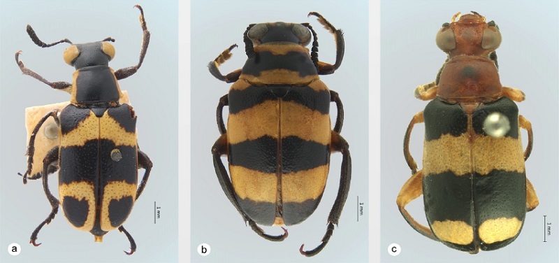 Redescripción. Macho. Longitud 7.2-8.9 mm, ancho 2.7-3.6 mm (n = 3). Color. Cabeza y antenas negras; ápice del labro, mandíbulas, palpos maxilares y labiales marrón; pronoto negro, márgenes laterales amarillos; escutelo negro; élitros amarillos con una mácula negra en la región humeral que cubre la base de los élitros, una banda negra transversal a la mitad, que no toca los márgenes, y otra mácula al final de cada élitro; porción ventral marrón, parte del metaesterno y abdomen amarillo, ventrito V marrón. Cabeza. Occipucio con puntos dispersos; gena punteada con setas; vértex escasamente punteado; espacio interocular con escasas o nulas puntuaciones en la parte media; frente ligeramente prominente. Clípeo punteado y con setas esparcidas en la base. Labro con puntos y setas cerca de la base. Tórax. Pronoto más ancho que largo, subrectangular, base más ancha que la porción anterior, disco convexo, con puntos esparcidos y con 2 surcos diagonales anteriores tenues, base con un reborde. Escutelo triangular, con escasas puntuaciones y setas erectas, ápice ligeramente emarginado. Élitros paralelos, convexos, punteados profundamente, húmeros prominentes proyectados anterolateralmente, ápices redondeados. Metaesterno con puntos finos y setas esparcidas. Metaepisterno excavado en la región basal con puntuaciones y pubescencia conspicua, región posterior sin impresiones y glabra. Patas con setas; metafémur no armado; tibias dorsalmente con una hilera de dentículos, metatibias ventralmente llanas, glabras, micropunteadas y con 2 carenas. Abdomen. Pigidio punteado con setas, ápice redondeado. Ventritos con puntos y setas dispersas, ventrito V con un surco en la parte terminal, ápice truncado. Edeago: lóbulo medio esclerosado, márgenes laterales estrechándose por delante de la parte media, ligeramente curvado en vista lateral, ápice truncado, apófisis poco esclerosadas delgadas, más amplias en la parte terminal; tegmen esclerosado, pieza basal corta y robusta, anillo lanceolado, lóbulos laterales fusionados, ápice redondeado con setas.