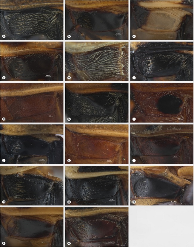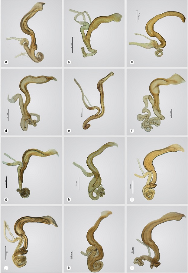 Las observaciones se realizaron en un microscopio Zeiss V-8. Cada especie se ilustró en diferentes vistas, así como el edeago y la espermateca de las especies cuya extracción fue posible. La toma de fotografías se realizó con una cámara Axiocam MRC5 montada en equipo Zeiss modelo Axio zoom V.16. Las espermatecas se las colocaron sobre un portaobjetos embebidas en glicerina para fotografiarlas. Las medidas se expresaron en milímetros; n indica el número de ejemplares observados.