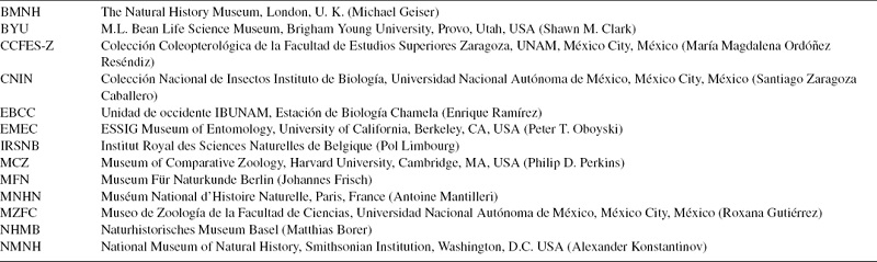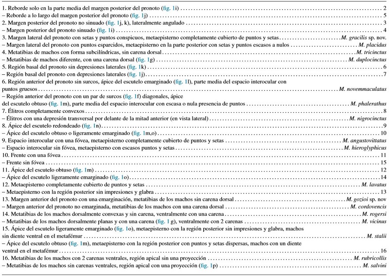 Se revisaron 299 ejemplares procedentes de distintas colecciones (tabla 1), en las cuales no se pudieron ubicar ejemplares de M. perroudi Pic y M. quadrilineatus Guerin-Meneville. Después de revisar las colecciones de Pic y Guerin-Meneville que se encuentran en el MNHN (Cambefort, 2007), tampoco se encontraron los ejemplares tipo de dichas especies.