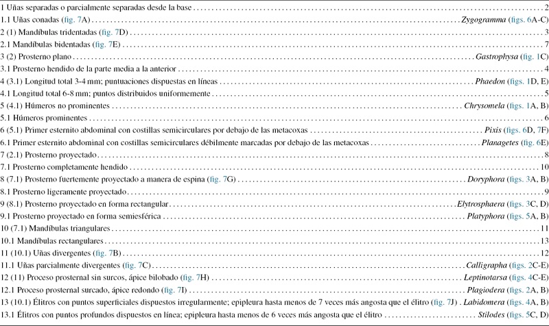 Las Chrysomelinae son una de las subfamilias más diversas dentro de los crisomélidos con más de 3,000 especies que se agrupan en 130 géneros (Reid, 2014). La mayoría de las especies se distribuyen en zonas templadas (Reid, 2006). En México se registran 14 géneros y 180 especies (Ordóñez-Reséndiz, 2014). La información taxonómica del grupo se circunscribe principalmente a las descripciones originales y a pesar de que actualmente gran parte de la literatura es de fácil acceso, las descripciones no son suficientes para asignar adecuadamente las especies a sus géneros correspondientes, ya que el número de caracteres es limitado y en ocasiones son subjetivos. Aunque para México existen trabajos como el de Anaya, Equihua y Prado (1987), en el cual se presenta una clave taxonómica para los géneros y especies del valle de México, o los de Anaya y Burgos (1990) y Burgos y Anaya (2004) que realizaron un estudio similar para los crisomelinos de Morelos, aún no hay estudios taxonómicos que incluyan todos los géneros y especies reconocidas para el país. Es por eso que el objetivo del presente trabajo es proporcionar herramientas taxonómicas que faciliten el estudio de la fauna de crisomelinos mexicanos. Se presentan descripciones generales para cada uno de los 14 géneros de Chrysomelinae y una clave dicotómica para reconocimiento de los mismos, además de fotografías que ilustran algunos representantes de cada género.