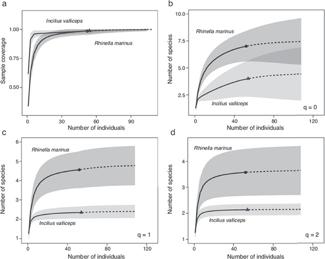 To compare between R. marina and I. valliceps, we produced rarefaction and extrapolation sample-size-based and coverage-based curves to provide asymptotic estimators of diversity based on Hill numbers with their respective 95% confidence intervals, constructed using a bootstrap method (Chao et al., 2014). To provide an estimate of the sample size needed to achieve a fixed degree of sampling completeness [when the proportion of undetected species remains unchanged even when the sample size increases (Chao and Jost, 2012)] we constructed a sample completeness curve by combining the sample-size-based and the coverage-based estimations. We extended all extrapolations up to double the reference sample size (n = 52 and 54 for R. marina and I. valliceps, respectively) to predict parasite diversity in each toad species by doubling the sampling size.
