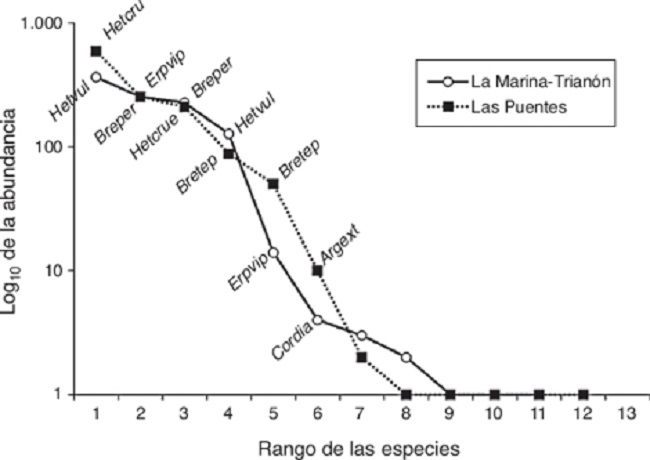 Se usaron curvas de dominancia/diversidad (Whittaker plots, Whittaker, 1965), utilizando el logaritmo de la abundancia de las especies para analizar los tipos de distribución de la abundancia en las comunidades. Los vectores de abundancia de ambos sitios se compararon utilizando la prueba de Kolmogorov-Smirnov (Magurran, 2004; Rex, Kelm, Wiesner, Kunz y Voigt, 2008; Sokal y Rohlf, 2012).