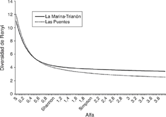 Para comparar la diversidad se usaron los perfiles de diversidad de Renyi (Jakab, Muller, Devai y Tothmeresz, 2002; Tothmeresz, 1995, 1998) sobre la riqueza y equidad de los ensamblajes. Las comparaciones de diversidad fueron hechas de acuerdo con lo propuesto por Southwood y Henderson (2009). La función de Renyi depende del parámetro alfa (α) que, al tomar valores bajos, hace que el método sea extremadamente sensible a las especies raras, mientras que, al aumentar, la diversidad se hace menos sensible a las especies raras y, en los valores más altos, el método solo es sensible a las especies comunes. Cuando se tienen los perfiles de diversidad de 2 ensamblajes y sus líneas se intersectan, significa que uno de los ensamblajes es más diverso en especies raras, mientras que el otro lo es en especies comunes. Los perfiles de diversidad fueron realizados con el programa Species Diversity and Richness versión 3.0. (Seaby y Henderson, 2002). Los índices de diversidad de Shannon (H’), Simpson (D) y Berger-Parker (d) (proporcionados por los perfiles de diversidad de Renyi para valores de α 1, 2 y 4, respectivamente) fueron comparados estadísticamente mediante las pruebas de permutación y «boostraping» implementadas en el programa PAleontological STatistics (Hammer, 2014). Se calculó el número efectivo de especies de acuerdo con Jost (2006). Adicionalmente se calculó la diversidad funcional mediante el índice de Shannon (HDF’) usando las proporciones de especies para las siguientes categorías por ocupación de microhábitat: sujetadores (claspers), fondeadores (sprawlers), soterrados (hiders) y cavadores superficiales (shallow burrowers) (Corbet, 1999). Por otro lado, la similitud entre ambos sitios se calculó para datos de presencia/ausencia mediante el índice de Sorensen y para datos de abundancia con el índice de Bray-Curtis, en ambos casos utilizando el programa PC-ORD 4.5 (McCune y Grace, 2002). Finalmente, se realizó un análisis de correspondencia canónico entre el grupo de variables fisicoquímicas y el de las abundancias de las especies utilizando CANOCO 4.5 (Ter Braak y Smilauer, 2002).