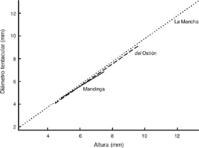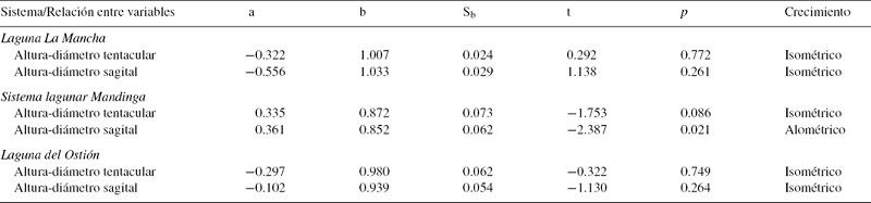 El análisis de regresión simple mostró que la relación entre la altura y el diámetro tentacular fue significativo para las 3 poblaciones (La Mancha: F = 1,727.1, g. l. = 1/48, p < 0.0005, R2 = 0.973; Mandinga: F = 144.41, g. l. = 1/48, p < 0.0005, R2 = 0.751; del Ostión: F = 249.57, g. l. = 1/48, p < 0.0005, R2 = 0.839). De manera similar, para cada sistema las relaciones altura-diámetro sagital fueron significativas (La Mancha: F = 1,244.6, g. l. = 1/48, p < 0.0005, R2 = 0.963; Mandinga: F = 190.97, g. l. = 1/48, p < 0.0005, R2 = 0.799; del Ostión: F = 300.51, g. l. = 1/48, p < 0.0005, R2 = 0.862). Con respecto al tipo de crecimiento corporal de los individuos, se observó que las poblaciones de La Mancha y del Ostión, donde los individuos alcanzan tallas mayores, en las relaciones altura-diámetro tentacular (fig. 2) y altura-diámetro sagital presentaron un crecimiento isométrico (tabla 1), por lo que su forma tiende a ser esférica. En el caso de la población del sistema lagunar de Mandinga, la relación altura-diámetro tentacular (fig. 2) también presentó un crecimiento de tipo isométrico (tabla 1), mientras que la relación altura-diámetro sagital mostró un crecimiento alométrico negativo (tabla 1), por lo que su forma tiende a ser ovoide; Greve (1975) mencionó que la forma que presenta P. pileus va de ovoide a esférica a lo largo de su desarrollo.