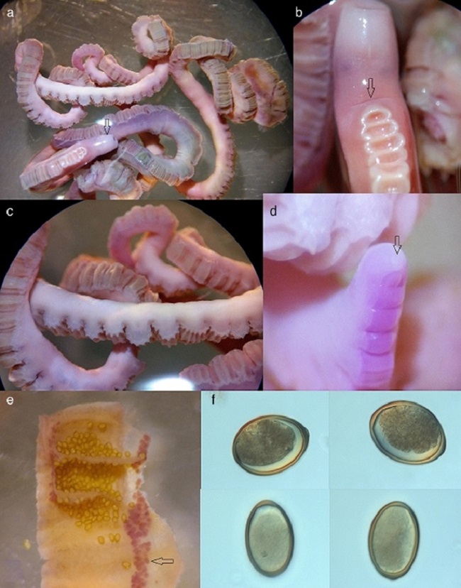 The ventral haptor extends almost the entire length of the body, consisting of a single row of 1668 alveoli subdivided by the transverse septum (Figs. 1a–d and 2a, c). This is similar to Bray’s (1984) report of 1500 alveoli in a specimen of M. cristata obtained from a hammerhead shark, S. lewini, on the shores of South Africa. Our M. cristata specimen has a terminal mouth in the form of funnel; a ventral genital pore anterior to the haptor (Figs. 1b and 2a, b); oval, operculated eggs measuring 0.12 × 0.08 µm (Figs. 1e, f and 2e, f); and vitellaria formed by 2 bands of lateral (Fig. 1f).