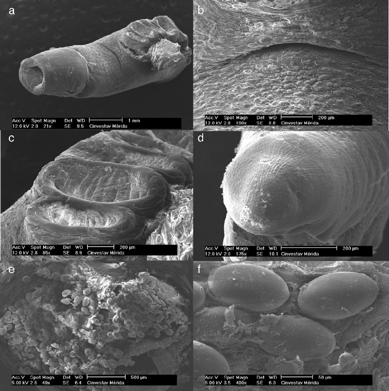 We report the presence of 3 individuals of M. cristata in the gallbladder of a male hammerhead shark, S. lewini (Griffith & Smith, 1834), caught by the artisanal fishery in Chachalacas, Veracruz, Mexico. The specimens were placed in a bottle with 7% saline solution, and cooled in ice to encourage their relaxation and to be able to separate them. Subsequently, they were fixed in warm formalin at 4%. In the laboratory the samples were transferred to 70% ethanol. Due to the large size of the specimens, it was not possible to prepare permanent slides; however, 1 individual was prepared for scanning electron microscopy (SEM). For SEM, the specimen was washed for 30 min with 0.1 M sodium cacodylate buffer, and post-fixed with 1% osmium tetroxide for 30 min. Subsequently the sample was washed again for 30 min in sodium cacodylate and then dehydrated in ethanol gradients from 30% to 100% for 10 min at each step; finally it was dried in a critical point dryer. The sample was subsequently recovered with a film of typically one evaporator in high vacuum (sputter/coater Polaron SC7640). Micrographs were obtained using a Philips XL-30 environmental SEM. One specimen was deposited in the Colección Nacional de Helmintos (CNHE) at the Instituto de Biología, UNAM, as reference number CNHE-9994.