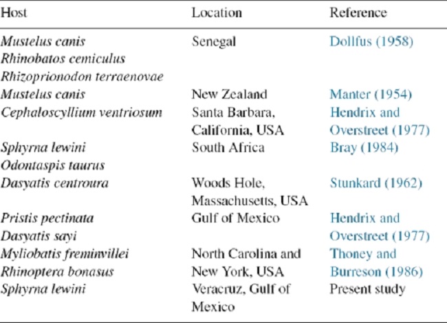 This is the first report of M. cristata in S. lewini in Mexican waters and for the coast of Veracruz. Further research is necessary as we currently know very little about the life cycle of these organisms. Such studies should include a parasitological examination of the stomach contents of other elasmobranch species, particularly those that have already been identified as hosts (Table 1), as well as a pathology assessment of the damage caused to the gallbladder. Once this information has been collected, it will be possible to identify a potential intermediate host; it is unlikely that a single intermediate mollusk host occurs in such a broad range of diverse habitats.