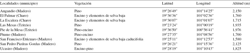 La presencia de P. fulvopilosa en estas localidades (tabla 1), permite plantear que la especie puede estar presente en las áreas elevadas de la cuenca del río Balsas en Michoacán y el Estado de México, dentro de un rango altitudinal que va de 1,500 m con bosques templados de transición (encinares con elementos de selva baja caducifolia) y hasta poco más de los 2,000 m en bosques templados de pino y pino encino.