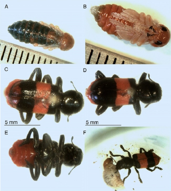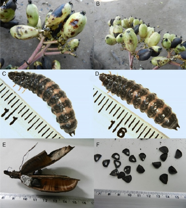 Larvae (Fig. 1C and D) of a beetle were recorded from October 5, 2015 to April 3, 2016. On November 3, 2015, the first pupal chamber was observed inside a boll. Pupal chambers were whitish, fibrous, 1–2 mm in thickness, and were constructed mainly in basal boll areas, although in some cases in the middle (Fig. 1E and F). First pupa (Fig. 2A and B) was observed on April 4, 2016. The timing of adult emergence was not uniform: the first adults (Fig. 2C–E) emerged on April 26, 2016 and the last adult emerged on May 3, 2016. The entire developmental cycle of the insect occurred inside the boll. Usually one adult, and less frequently 2 adults, emerged from a single boll. The emerged adults were placed individually in a glass container (size 150 mL) with small holes (2 mm diameter) in the top, and were fed with abdomens of adult cactus and agave weevils, and with larvae of agave weevils (Fig. 2F). Specimens were preserved in 70% alcohol, pinned, and identified by Víctor H. Toledo and Jacques Rifkind. Voucher specimens were deposited in the Colección de Insectos (CIUM) del Centro de Investigación en Biodiversidad y Conservación de la Universidad Autónoma del Estado de Morelos, Cuernavaca, Morelos.