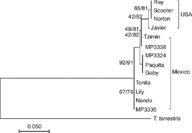 We obtained PCR products of the microsatellites in 9 of the 11 samples. A total of 24 alleles were detected for the 6 loci ranging from 3 to 6 alleles/locus with a mean allelic richness Rs = 3.94 (standard deviation, s = 0.97) for all tapir samples pooled together and Rs = 3.29 (s = 1.01) when including only samples of tapirs from Mexican populations. These Rs values were not different of homologue data of tapirs from Panama and Costa Rica (F < F-crit, p = 0.38). The observed heterozygocity (Ho) for each locus was larger than the expected (He) and the mean FST = 0.021 was no different between Mexican and USA individuals. The mean value of FIS = −0.295 across the loci suggested an excess of heterozygocity inside the whole group (Table 2). The examination of the H–W equilibrium across the loci for the whole group showed a deviation in the case of Tter09. Nevertheless, the Fisher’s exact test applied to each locus showed no deviations from the H–W equilibrium (p > 0.05). Likewise, Fisher’s exact test applied to samples from captive individuals in Mexico (from USA zoos and local wild populations) showed no significant deviation from the H–W equilibrium. There were no significant differences among the FST, FIS and Fit values in the Amova analysis P (random ≥ data). We found 6 private alleles, 4 of them within samples of Mexican tapirs and 2 more within samples of tapirs donated by USA zoos. We isolated DNA from 21 of the 28 samples of feces from the field and obtained amplicons in 13 out of these 21 samples; 7 of them were within the expected range of weight for the D-loop fragment. Only 3 of these sequences were clear enough to be analyzed (MP3324, MP3335 and MP3338). Therefore, there were only 10 sequences of the control region from individuals in captivity and 3 from samples collected in the field. No sequences of the control region of T. bairdii were found in the data bank of the National Center for Biotechnology Information (NCBI). However, the analysis of the 10 T. bairdii sequences using BLASTn indicated a similarity of up to 87% with the mtDNA of T. terrestris (GeneBank: AJ428947.1) and up to 81% with the mtDNA of T. indicus (GeneBank: KJ417810). Moreover, this analysis showed the existence of 7 haplotypes with 15 polymorphic sites, Hd = 0.846 and Pi = 0.0128. All the nucleotide changes were transitions. The dendrograms generated using maximum likelihood and Bayesian inference showed that samples of tapirs donated by USA zoos were arranged in a monophyletic sub-group whereas samples of tapirs from wild populations in Mexico constituted a paraphyletic group. The divergence in the control region sequences within tapirs from Chiapas was up to 0.021% whereas within tapirs from USA zoos, was 0.005% (Fig. 1).