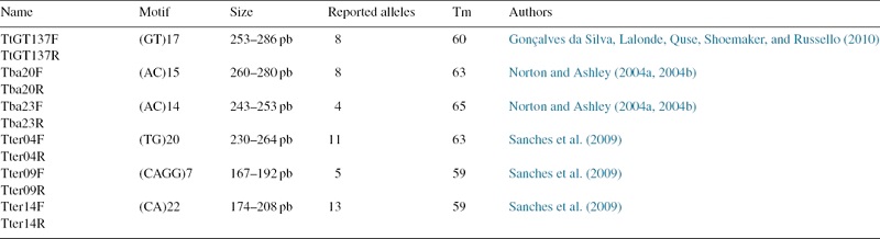 Ten different microsatellites loci previously developed using Tapirus terrestris and T. bairdii sequences were tested using DNA feces samples of T. bairdii requested to the Los Angeles Zoo. Six of the 10 microsatellites (Table 1) occurred in all the tested individuals thus, were selected for the analyses. For detection analysis primers were marked with 5-FAM fluorochrome (Invitrogen). Each reaction was prepared following the instructions of the platinum Taq DNA polimerase kit (Invitrogen). After preparation, the samples were run in a GeneAmp PCR System 2700 (Applied Biosystems) using the conditions reported for their authors (Table 1).