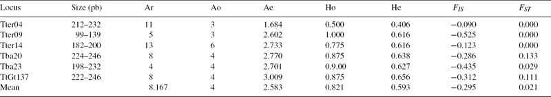 Allelic richness (Rs) was estimated with the softwares GeneAlEx version 6.3 (Peakall & Smouse, 2006) and FSTAT 2.9.3 (Goudet, 2001). We estimated the allelic richness of all the captive tapirs in Mexico (samples from tapirs donated by USA zoos and originated from wild populations pooled). Afterwards, we separated these samples to contrast their allelic richness against the corresponding allelic richness of individuals from Costa Rica and Panama (Norton & Ashley, 2004b) applying Wilcoxon tests. We used the software GeneAlEx and Genetic Data Analysis GDA (Lewis & Zaykin, 2001) to estimate observed heterozygocity (Ho), expected heterozygocity (He) and to run Hardy–Weinberg (H–G) equilibrium tests. We applied an analysis of molecular variance (Amova) using the software GeneAlEx. We calculated the genetic diversification values of FIS, FIT and FST with the software FSTAT ver. 2.9.3 (Goudet, 2001) and applying a Bonferroni correction (α = 0.05). The allelic richness found in Mexican tapirs was compared against the values of 6 microsatellites loci reported by Norton and Ashley (2004b) using Anova.