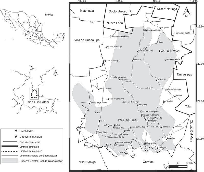 El municipio de Guadalcázar (22°28.8′-23°19.2′ N, 99°59.4′-100°37.8′ O) tiene una extensión de 3,800 km2 (Fig. 1). Forma parte de la Meseta Central o Altiplano Potosino y es atravesado por la sierra de Guadalcázar, la cual es una de las extensiones de la Sierra Madre Oriental y parte de los sistemas orográficos que componen esta región. Las elevaciones oscilan entre 1,000 y 2,500 m, con un sistema de sierras, planicies, lomeríos, mesetas y cerros. En el área predominan las rocas sedimentarias calizas en combinación con lutitas del Cretácico, y en algunas áreas, abundan los conglomerados sedimentarios del Neógeno (Inegi, 2002). Se han reportado 6 tipos de suelo: castañosem (háplico), litosol, regosol (calcárico), vertisol (crómico y pélico), xerosol (cálcico, gypsico y háplico) y yermosol (gypsico) (Inifap-Conabio, 1995). El tipo más abundante por su extensión es el litosol. Los suelos yesosos son particularmente relevantes, pues a estos se encuentran asociadas algunas especies vegetales edáficamente especializadas. En la zona se presentan 7 tipos de climas según García (1998), de los cuales el BS1hw (semiárido semicálido con lluvias en verano) es el predominante. La precipitación media anual en el área varía desde 300 a 800 mm y la temperatura media anual es semicálida en la mayor parte del municipio (Vidal-Zepeda, 1990a, Vidal-Zepeda, 1990b), con registros de 18 °C en zonas altas y 20 °C en zonas bajas (Inegi, 2007).