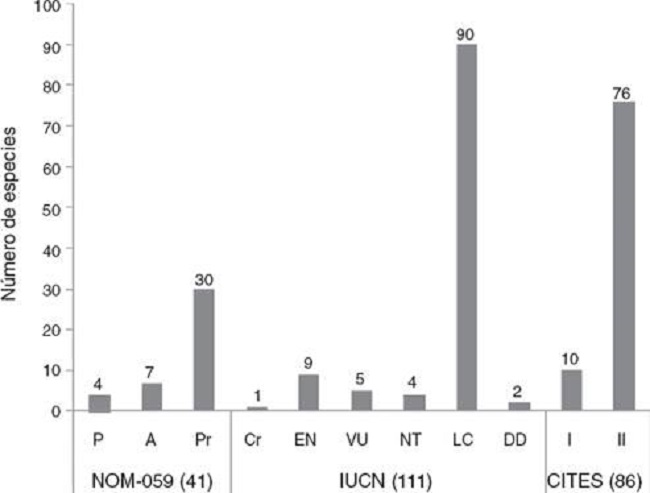 Del total de especies registradas en este trabajo, 123 presentan algún grado de amenaza (15.1% de la flora). Del total de las especies amenazadas, 34 aparecen en las 3 listas, 47 en 2 listas y el resto solo aparecen en una lista (Fig. 2). Las familias con mayor número de especies en alguna categoría de riesgo son Cactaceae (80), Leguminosae (9), Orchidaceae (6) y Fagaceae (4).