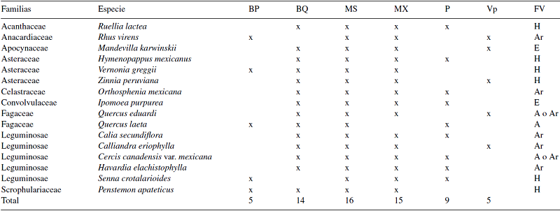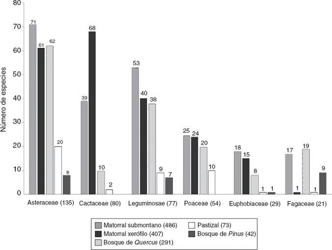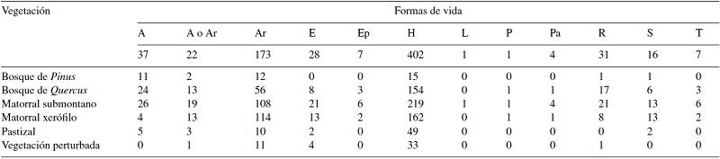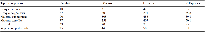 En la región de estudio se pueden distinguir 5 tipos de vegetación: matorral submontano (Rzedowski, 1956), matorral xerófilo, bosque de Quercus, bosque de Pinus y pastizal (Rzedowski, 1978). El tipo de vegetación con mayor riqueza de especies es el matorral submontano (Tabla 5). Además de los árboles, arbustos y hierbas que definen la estructura de la vegetación existen plantas epífitas, rupícolas, enredaderas, trepadoras y otras menos comunes como lianas, palmas y parásitas. Un grupo destacado son las suculentas, que predominan en los ambientes xerófilos y dependiendo de la forma de sus tallos reciben varias denominaciones, como es el caso de la familia Cactaceae (Vázquez et al., 2012) y Agavaceae (García, 2011) (Tabla 6). En general, la forma de vida herbácea contiene el mayor número de especies, siendo este el patrón que se repite en todos los tipos de vegetación (Tabla 7).