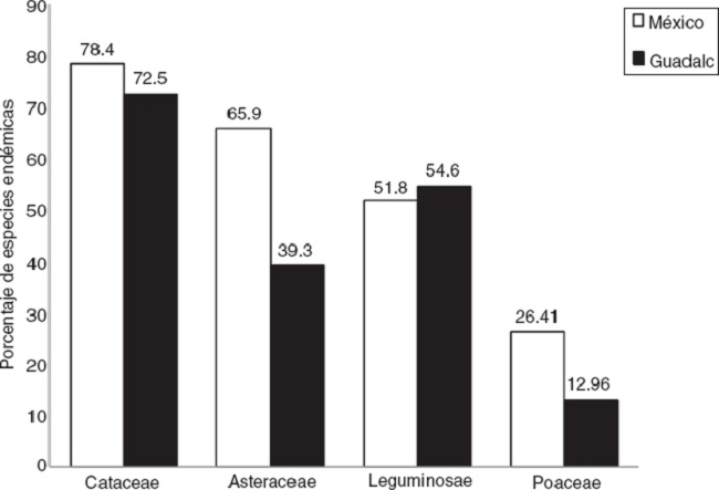 México contiene una gran cantidad de especies endémicas de las familias Asteraceae (Suárez-Mota y Villaseñor, 2011, Villaseñor, 2003), Cactaceae (Arias et al., 1997, Hernández y Gómez-Hinostrosa, 2005, Hernández y Gómez-Hinostrosa, 2011), Leguminosae (Sousa y Delgado, 1998) y Poaceae (Espejo, 2012). Los porcentajes de endemismo de estas familias analizadas para Guadalcázar son similares a las proporciones estimadas para México (Fig. 4). La familia Cactaceae es la que tiene el mayor porcentaje de endemismos en Guadalcázar, lo cual podría deberse a que el estado de San Luis Potosí cuenta con el mayor número de especies de esta familia en México (Hernández y Gómez-Hinostrosa, 2005).