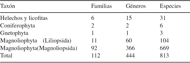 En el Apéndice 2 se presenta la lista florística: helechos y licofitas (Christenhusz et al., 2011, Smith et al., 2006), Coniferophyta (Gernandt y Pérez-de la Rosa, 2014), Magnoliophyta (Cronquist, 1981), con los cambios de adscripción que considera la propuesta de Angiosperm Phylogeny Group (APG III, 2009). Los nombres científicos, nombre de los recolectores con número de recolecta, tipos de vegetación (Rzedowski, 1956, Rzedowski, 1978), formas de vida (García, 2011, Vázquez et al., 2012) y tamaño de la planta se exportaron a una hoja de cálculo para el análisis de resultados.