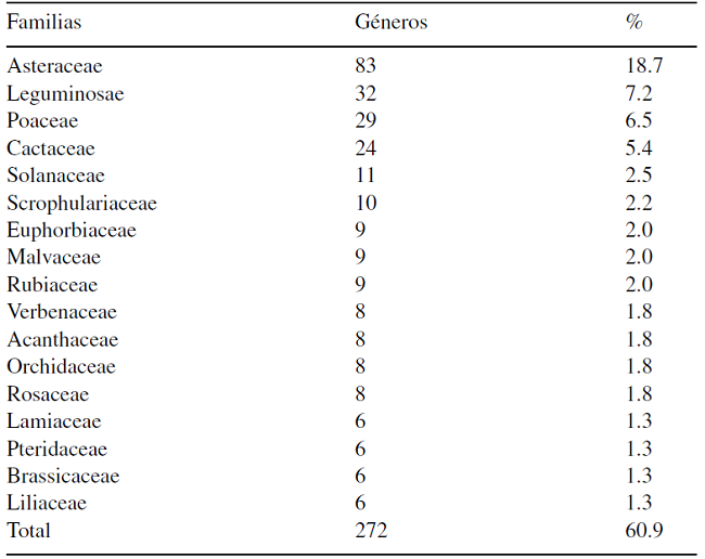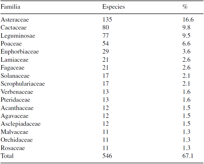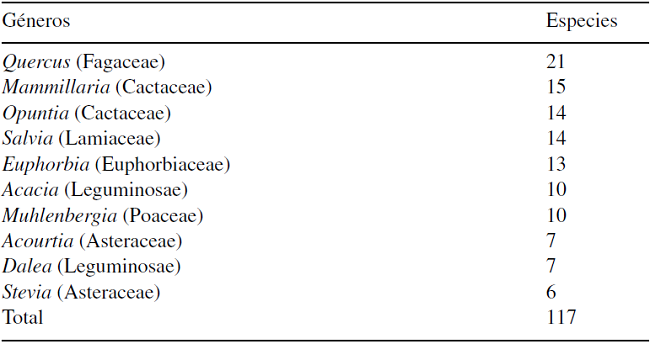 En la región habitan 813 especies. Del grupo de las Magnoliophyta, 104 especies son Monocotiledóneas y 669 Dicotiledóneas (Tabla 1). Las familias que resultaron tener la mayor riqueza de géneros y especies son: Asteraceae, Cactaceae, Leguminosae o Fabaceae y Poaceae; las especies de estas 4 familias representan el 42.6% de la flora total en el municipio (Tabla 2, Tabla 3). Por otra parte, el género con mayor número de especies es Quercus (Tabla 4).