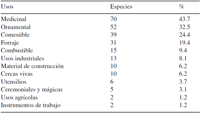 Del total de especies, 160 se registraron con alguna utilidad. Los usos se clasificaron en 12 categorías, de los que el uso medicinal —con 70 especies— es el más extendido (Tabla 8). La cantidad de usos registrados para una especie determinada va de uno hasta 6 y la mayoría de las especies presenta una o 2 modalidades (141 especies); siendo los usos más comunes el medicinal, el ornamental y el comestible. La única especie que tiene reportado hasta 6 usos (medicinal, combustible, material de construcción, forraje, cercas vivas, usos industriales) es Acacia farnesiana (Leguminosae). La familia Cactaceae comprende 56 especies con algún uso (principalmente ornamental).