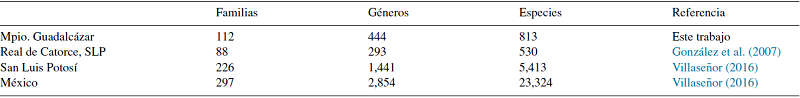 La riqueza florística de Guadalcázar reportada aquí es importante en el contexto de las estimaciones de riqueza de la flora de México, sobre todo si se toma en cuenta que la mayor parte de la superficie del municipio corresponde a zonas áridas. Según los estimados para la flora vascular de México de Villaseñor (2016), el número de especies presentes en Guadalcázar corresponde al 3.4% del total inventariado para el país (23,314 especies) y al 15% de las que existen en San Luis Potosí (5,413 especies). Además, si se le compara con áreas relativamente cercanas, y con una extensión y condiciones ambientales similares, como es el caso de la sierra del Real de Catorce (González, Giménez, García y Aguirre, 2007), la riqueza en Guadalcázar es sobresaliente (Tabla 9). Una explicación es que es consecuencia de una alta heterogeneidad ambiental, en una gran planicie dominada por matorral xerófilo, interrumpida por la sierra de Guadalcázar, lo cual resulta en un mosaico climático propicio para el establecimiento de una variedad de tipos de vegetación, lo cual coincide con lo interpretado por Hernández et al. (2001). Hernández y Bárcenas (1995, 1996) postularon que la porción más árida de esta región, posiblemente actuó como un refugio para la vegetación xerófila durante el último período glaciar del Pleistoceno.