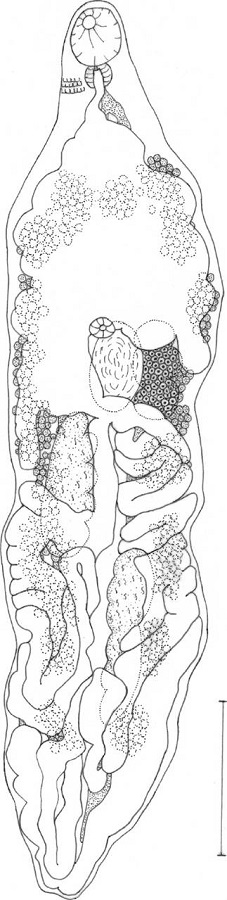 Description based on 12 mature specimens: body spindle shaped, with pointed anterior and posterior ends; 2.52–6.04 (3.89) mm long, 0.84–1.97 (1.25) mm of maximum width at the preovaric region. Tegument thick, no spines, showing plications forming a grid. Oral sucker terminal, round, 271.6–417.1 (348.39) long, 217.6–407.4 (339.5) wide; opening directed ventrally. Pharynx oval, 126.1–242.5 (183.42) long, 106.7–213.4 (168.43) wide; oral sucker/pharynx ratio 1:0.39–0.62 (0.52). Gland cells surrounding anterior region of pharynx. Esophagus 48.5–126.1 (76.21) long, surrounded anteriorly by gland cells, sometimes obscured by uterus. Ceca bifurcating at 465.6–649.9 (559.95) [10.6–16.8 (14.28)% of body length (BL)] from anterior extremity. Ceca narrow, terminating blindly near posterior extremity. Ventral sucker weakly developed, sometimes obscured by ascending uterus, 97–135.8 (106.7) long, 87.3–135.8 (109.93) wide, at 1.32–2.04 (1.66) mm [33.7–47.2 (41.33)% of BL] from anterior extremity. Suckers length ratio 1:0.23–0.36 (0.31). Testes 2, elongate slightly lobed, oblique, immediately posterior to ovary. Anterior testis opposite to ovary, 388–873 (583.94) long, 194–339.5 (258.02) wide. Posterior testis 582–1115.5 (725.56) long, 252.2–417.1 (308.63) wide. Cirrus sac obscured by ascending uterus. Ovary irregular, lobed, 339.5–679 (521.64) long, 242.5–436.5 (312.56) wide; at 1.2–2.39 (1.83) mm [40.6–56.81 (47.94)% of BL] from anterior extremity. Seminal receptacle adjacent partially overlapping ovary; 291–533.5 (430.68) long, 194–407.4 (291.97) wide. Mehlis gland dorsal to seminal receptacle. Laurer's canal not observed. Vitellaria forming clusters overlapping with each other, distributed sidelong, dorsally invading space between caeca in their anterior limit and in the postesticular region. Anterior limit of vitellaria 242.5–485 (419.04) [7.43–11.56 (10.91)% of BL] from anterior end; posterior limit at level of posterior testis on the ovarian side of body, at end of caeca on the opposite side of ovary. Descending uterus forming transversal and diagonal loops on ovarian side of body, partially overlapping testis, filling intra and extracecal space toward posterior end of body. Ascending uterus forming longitudinal loops oriented anteriorly reaching the level of posterior testis, and continuing anteriorly forming transversal and short longitudinal loops at the level of testes, partially overlapping anterior testis and seminal receptacle, and filling with transversal loops the entire preovarian region. Genital pore ventral to posterior border of oral sucker. Eggs dark brown, 16.95–26.63 (21.11) long, 9.68–16.95 (13.59) wide. Excretory vesicle not observed. Excretory pore terminal.