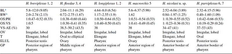 The new species also differs from H. longiplexus and H. macrorchis in the size of the acetabulum compared to the oral sucker, which is larger in those species [1:0.40–0.50 (0.43) in H. longiplexus, 1:0.41–0.49 (0.45) in H. macrorchis and 1:0.23–0.36 (0.31) in H. nicolasi] (Cort, 1915, Caballero, 1941, Stafford, 1902).