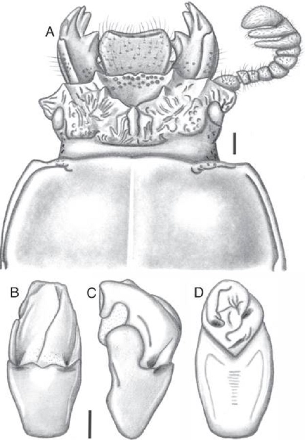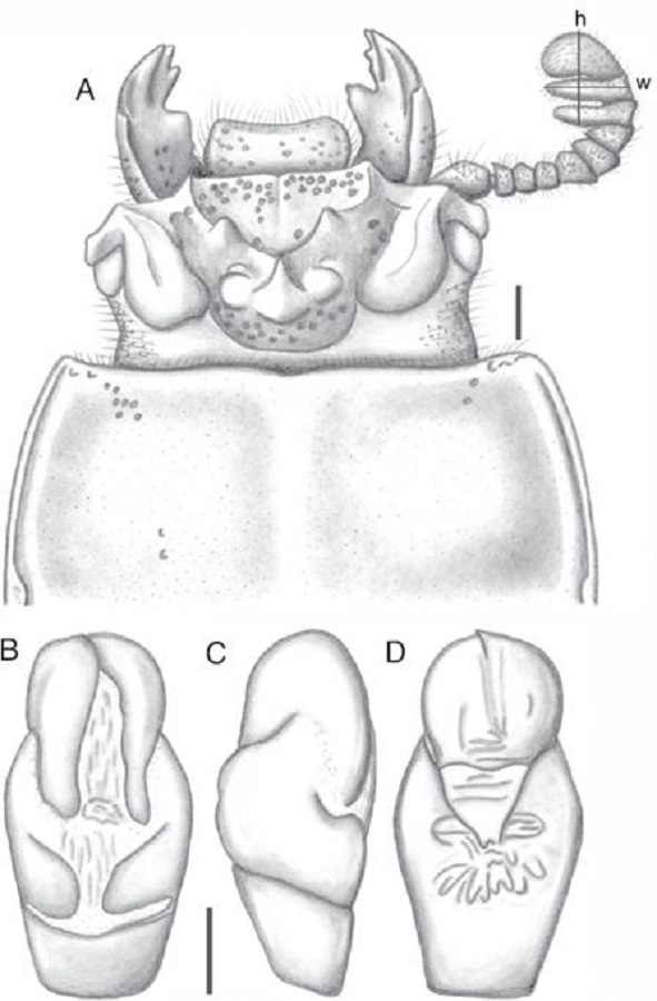 Description: Habitus: midsize, total length 24.0–28.9 mm, brachypterous, body convex shiny black. Head: labrum with anterior border straight or slightly concave, covered with scarce setae, setae are less dense in medial labrum. Clypeus hidden under the frons, with anterior angles strongly developed under the mediofrontal tubercles and of similar size as mediofrontal tubercles. Frons wide, anterior frontal edge with small middle indentation, without secondary mediofrontal tubercles. Mediofrontal tubercles projected forward, smaller than inner tubercles. Inner tubercles conical, with free apex, joined to mediofrontal tubercles by a weak ridge, placed mid distance between the mediofrontal tubercles and the central tubercle apex. Posterofrontal ridges “V” shaped. Area between the frontal ridges heavily punctuated on the anterior half. Cephalic mamelon (sensuJiménez-Ferbans & Reyes-Castillo, 2014) present and whole. Mesofrontal structure of the “marginatus” type (Reyes-Castillo, 1970), with central tubercle wide at the base, with or without a sulcus in the posterior part, apex not free. Lateroposterior tubercles marked. Lateropostfrontal areas glabrous, shiny, and impunctate. Eyes reduced, with canthus covering ½ of the eye in lateral view. Canthus glabrous or with 3 setae at the margin of the eye. Postfrontal groove semicircular and complete. Hypostomal process slightly separated from mentum, glabrous and reaching the superior part of the middle zone of the mentum. Medial basal mentum protruding ventrally, with fine line of setae at the posterior margin and reduced punctures (4) on its anterior border. Mentum with large lateral fossae, deep, glabrous and opaque. Antennal club trilamellate, with lamellae short (h longer than w, Fig. 1A). Internal tooth of the left mandible bidentate, simple on the right mandible. Dorsal tooth straight in dorsal view and slightly concave in lateral view. Dorsal mandibular pubescence covering the base of the mobile tooth and reaching the base of the internal tooth. Mandibular fossae short, reaching only half of the base of the mobile tooth. Maxilla with lacinia bidentate at the apex. Ligula tridentate, with middle tooth longer than lateral teeth. Middle palpomere of the labial palp 1.2 times wider and with the same length as the distal palpomere.