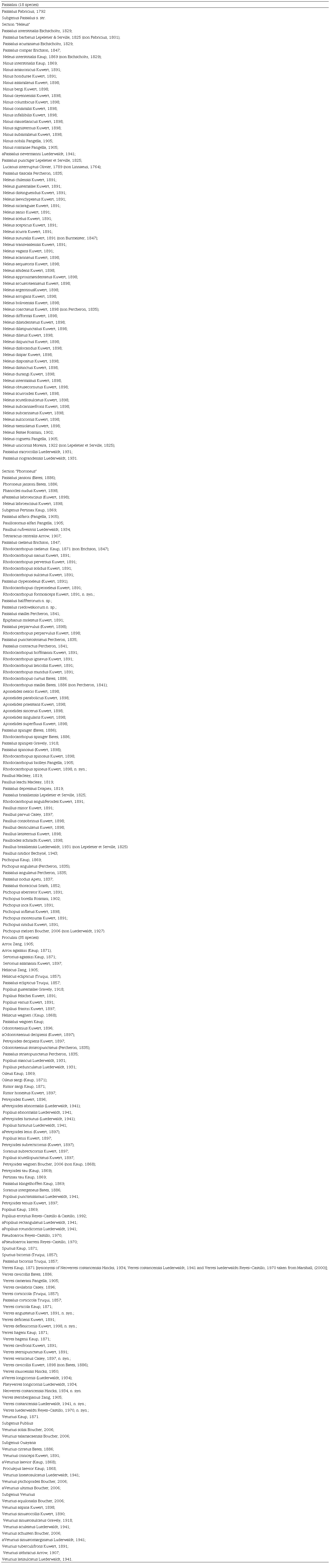 Passalus (Passalus) nevermanniLuederwaldt, 1941: described from Costa Rica in a posthumous publication, this species would correspond to a synonym of P. (Passalus) punctiger Lepeletier & Serville. In the description, Luederwaldt (1941) only cited a specimen from “Costa Rica, I-1933” in the collection of F. Nevermann.