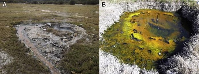 Four samplings were conducted on February 2nd (Winter), June 5th (Spring), October 6th (Summer), and December 5th (Fall) of 2013. Three samples were directly collected from microbial mats in each of the 2 hot springs at a depth of 30–50 cm from the surface. A criterion for selection of these 2 hot springs was whether the system was closed or open. One spring selected was a “closed system” with low water emission (Bonita), while the other (Tina) was an “open system” with constant water emission (Fig. 2). Microbial mat samples were immediately transported on wet ice to the lab. For water sampling, 500-mL sterile Kinex flasks were used to take water from each hot spring. Water samples were stored in darkness and transported to lab on dry ice.