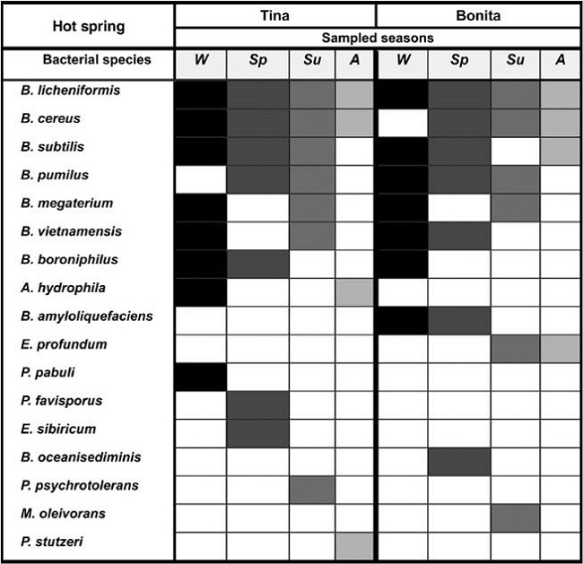 Abstract: In this study, we explored the diversity of culturable bacterial communities residing in hot springs from Araró, México, and analysed the effect of seasonality and related changes in physicochemical parameters of spring water. Two hot springs with unique features, Tina and Bonita, were analysed. Seventy-nine unique 16S rRNA gene phylotypes were detected, belonging to the bacterial phyla Firmicutes, Proteobacteria, and Actinobacteria. A group of dominant phylotypes of the genus Bacillus was recovered in 3 out of 4 of the sampling seasons. Another group of phylotypes was recovered in 2 samplings, while the remaining groups were detected in only 1 season. Ecological indexes for species richness and evenness showed moderate to low diversity in both hot springs, and a Sørensen analysis revealed that the 2 communities shared 64% of their bacterial phylotypes. Physicochemical parameters measured every season showed slight variations, except for temperature and arsenic content. Fluctuations in bacterial composition in the Tina hot spring were correlated mainly with salt content, while diversity in the Bonita hot spring was significantly correlated with temperature, pH, and arsenic content.