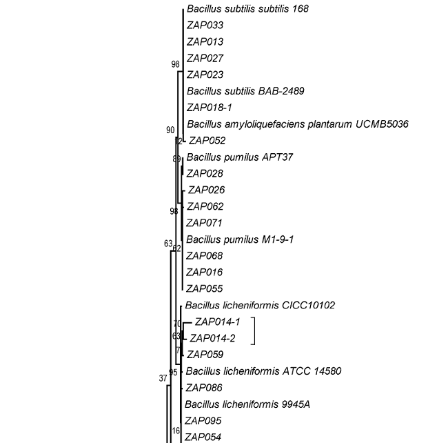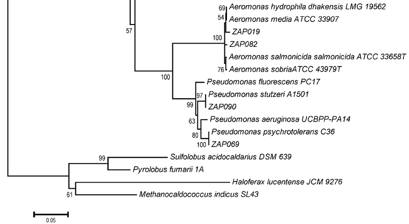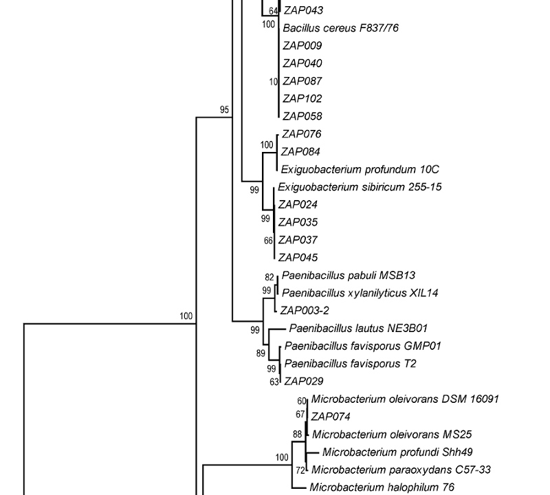 From randomly picked colonies subjected to RAPD analysis, 79 phylotypes (out of 109 bacterial isolates) were detected and subjected to 16S rDNA sequencing. Bacteria from 3 phyla were identified, including species from the genera Paenibacillus, Exiguobacterium, and Bacillus (76%) from the phylum Firmicutes, Aeromonas and Pseudomonas (18%) from the phylum Proteobacteria, and only Microbacterium (6%) from the phylum Actinobacteria. In total, 17 culturable bacterial species were detected in both hot springs. Figure 3 shows the phylogenetic relationships of the bacterial species. Fifty-seven 16S rDNA sequences, including the 17 representative bacterial species shared between both hot springs, were selected for the phylogenetic reconstruction based on length. All of the 16S rDNA sequences displayed close relationships with known bacterial species, particularly with representatives of the Bacillus genus. The clades were not associated with either of the hot springs or any other parameter measured.