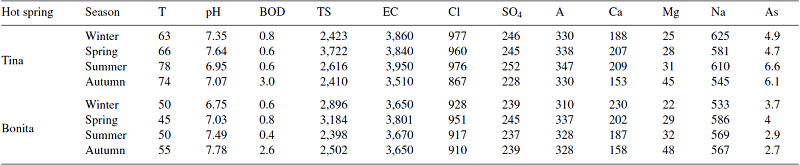 Physicochemical analyses, including faecal coliforms analysis, were performed in collaboration with the National Water Commission (Conagua-México) (Table 1). Arsenic concentrations in the water samples of the Bonita and Tina hot springs were measured by absorption spectroscopy using an atomic absorption spectrometer (Perkin-Elmer Analyst 200) with a hydride generation system. The measurement of fluoride was carried out with a conventional fluormeter.