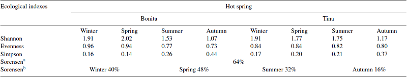 The bacterial communities of the microbial mats from Tina and Bonita hot springs were characterised by a few dominant taxa within the Firmicutes and by low abundance (Fig. 4). The Shannon index showed a similar low diversity of bacterial species for each hot spring in each of the 4 sampling seasons. The highest diversity was observed in the Spring and the lowest diversity was observed in the Fall for both Tina and Bonita. According to the Sørensen index, the 2 hot springs shared up to 64% of their bacterial species. However, this percentage varied, and in some seasons was much lower (Table 2). For example, during the Fall sampling, both springs shared only 16%, opposed to Spring, where they shared almost 50% of bacterial species.