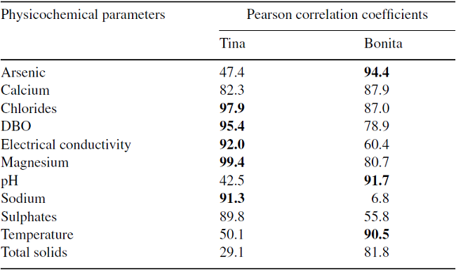 Pearson's correlation analysis suggested that water salts (such as Mg, Na, Cl), biological oxygen demand, and electrical conductivity all had effects on bacterial communities inhabiting Tina hot spring, whereas in Bonita, temperature, pH, and arsenic concentration exerted effects on bacterial diversity (Table 3). These results suggest that Tina and Bonita share some physical and biological features, but are not interconnected subsystems.