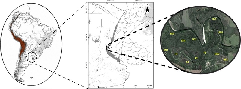 El muestreo se realizó en el Parque General San Martín (PGSM) que cuenta con una superficie de 400 ha, comprendida dentro del Área Natural Protegida «Parque Escolar Rural Enrique Berduc» (31°40’ S, 60°20’ O), ubicada en el Departamento Paraná, Provincia de Entre Ríos, Argentina (Fig. 1).