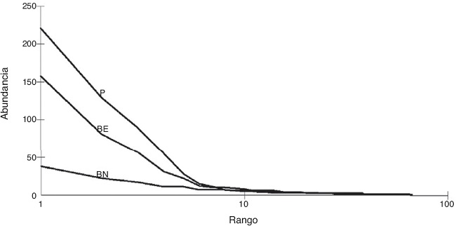 Los índices de diversidad de Shannon y de Simpson mostraron diferencias de significación estadística entre los ambientes (p < 0.05), donde el BN presentó el mayor valor, seguido del BE, y por último, el P. Respecto a la dominancia de especies, el ambiente P mostró el mayor valor y el BN el menor, diferenciándose significativamente entre los ambientes analizados (Tabla 2). Esto corresponde con lo observado en las curvas de rango-abundancia donde se registraron pocas especies dominantes en el P y el BE, y donde el BN mostró una comunidad más equitativa, con menor dominancia y mayor diversidad (Fig. 2).