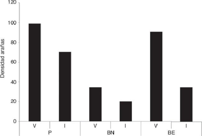 Se recolectaron 1,398 arañas y se identificaron 26 familias, correspondientes a 120 especies/morfoespecies. El P registró la mayor abundancia de arañas (678 individuos), seguido del BE (501) y el BN (219). En cambio la mayor riqueza de especies, la presentó el BN con un valor de 67 especies, mientras los ambientes P y BE presentaron 62 especies cada uno (Tabla 1).