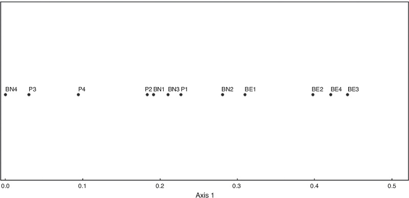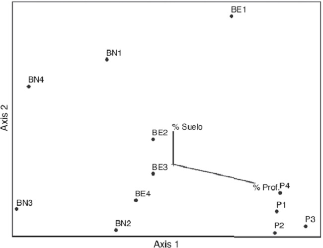 El ordenamiento de los sitios en cuanto a las variables ambientales mostró que el BN es el ambiente con mayor heterogeneidad, seguido por los pajonales y BE, el menos heterogéneo. (R2 = 0.748) (Fig. 4).