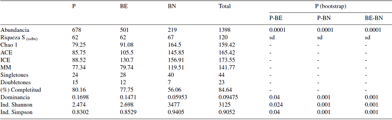 A nivel general, el inventario obtenido fue superior al 85%, mediante el estimador Michelis-Menten que calculó un 15% de especies más que las observadas. Este estimador de riqueza de especies también fue el mejor en las demás comunidades, siendo el inventario del ambiente P el más completo. El número de singletones resultó alto en el BN (40), pero bajo con respecto al número de doubletones (7) (Tabla 2).