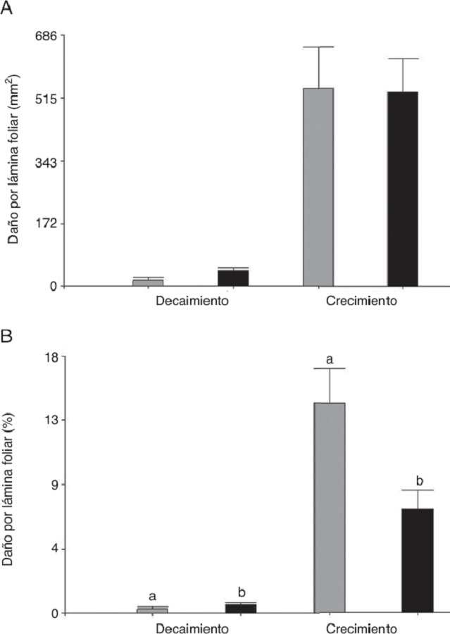 Los insectos herbívoros removieron en promedio hasta 684 mm2 de área foliar en E. azurea y hasta 790 mm2 en E. crassipes en el periodo de crecimiento, con un daño aparentemente similar en ambas especies de plantas (Fig. 1C). Sin embargo, cuando estos valores se analizaron en porcentaje, se pudo apreciar que el impacto que los herbívoros generaron fue diferente en cada especie de planta hospedera. En E. azurea el porcentaje de hoja dañada por herbivoría durante el periodo de crecimiento alcanzó en promedio hasta el 20.47%, mientras que en E. crassipes fue solo del 10.27% (Fig. 1D), debido a que el tamaño de área foliar de E. crassipes es mayor que el de E. azurea (Fig. 1A). En el periodo de decaimiento, los valores de herbivoría fueron menores en E. azurea respecto a E. crassipes; esta tendencia se observó tanto en valores absolutos (Fig. 1C) como en porcentaje (Fig. 1D). Cuando se compara el porcentaje de lámina foliar dañada entre periodos, hubo diferencias significativas en ambas especies hospederas (Fig. 1D), siendo mayor la herbivoría en el periodo de crecimiento que en el periodo de decaimiento tanto en E. azurea (F = 114.09, p < 0.0001, n = 60) como en E. crassipes (F = 34.08, p < 0.0001, n = 60). La herbivoría en E. azurea en el periodo de crecimiento fue 54 veces más alta que la producida en el periodo de decaimiento; en E. crassipes la herbivoría en el periodo de crecimiento fue 4 veces más alta a la producida en el periodo de decaimiento (Fig. 1D).