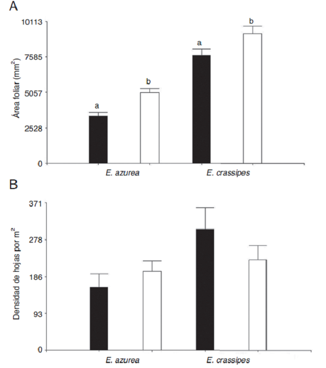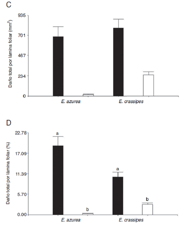 Los valores de herbivoría en hoja fueron calculados como daño promedio por lámina foliar considerando el daño acumulativo producido por los herbívoros desde que la hoja se despliega hasta que alcanza la madurez; estudios preliminares permitieron determinar que este periodo es de 30 días en las hojas de E. crassipes y E. azurea en el área de estudio, lo cual asegura que el daño acumulativo medido en hojas no se superponga entre las 2 fechas de muestreo. La herbivoría fue cuantificada en hojas verdes maduras, excluyendo las hojas jóvenes y no desplegadas (Boyd, 1978, Mattson, 1980). Los valores de herbivoría se expresaron como área foliar dañada (mm2) y porcentaje de la lámina foliar dañada por los herbívoros (%).