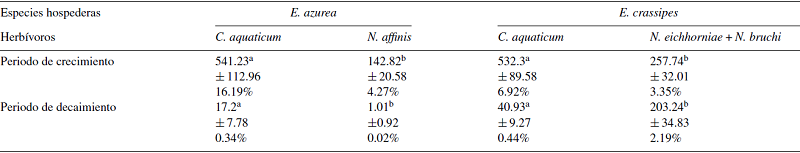 En E. crassipes las tendencias fueron diferentes en cada uno de los periodos de las poblaciones de plantas; el área foliar dañada por C. aquaticum fue significativamente mayor respecto al producido por N. bruchi y N. eichhorniae en la época de crecimiento (F = 9.48, p < 0.0045, n = 30), mientras que en época de decaimiento el daño por C. aquaticum fue significativamente más bajo que el de ambas especies de Neochetina (F = 20.27, p < 0.0001, n = 30). En esta especie hospedera, el daño de C. aquaticum fue el doble al producido por N. eichhorniae y N. bruchi en el periodo de crecimiento, mientras que en decaimiento ambas especies de Neochetina produjeron un daño 5 veces mayor que el producido por C. aquaticum (Tabla 1).