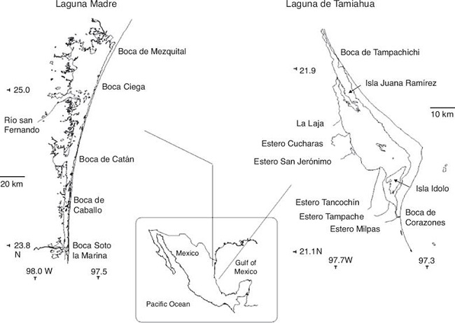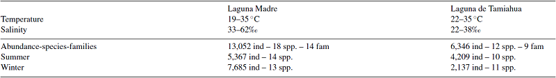 Laguna Madre and Laguna de Tamiahua experience marked seasonal changes in water temperature throughout the year. In Winter, values drop to 19 °C in Madre and to 22 °C in Tamiahua, while in Summer, there is a maximum of 35 °C in both lagoons. Salinity varied from 33 to 62‰ in Madre and from 22 to 38‰ in Tamiahua (Table 1).