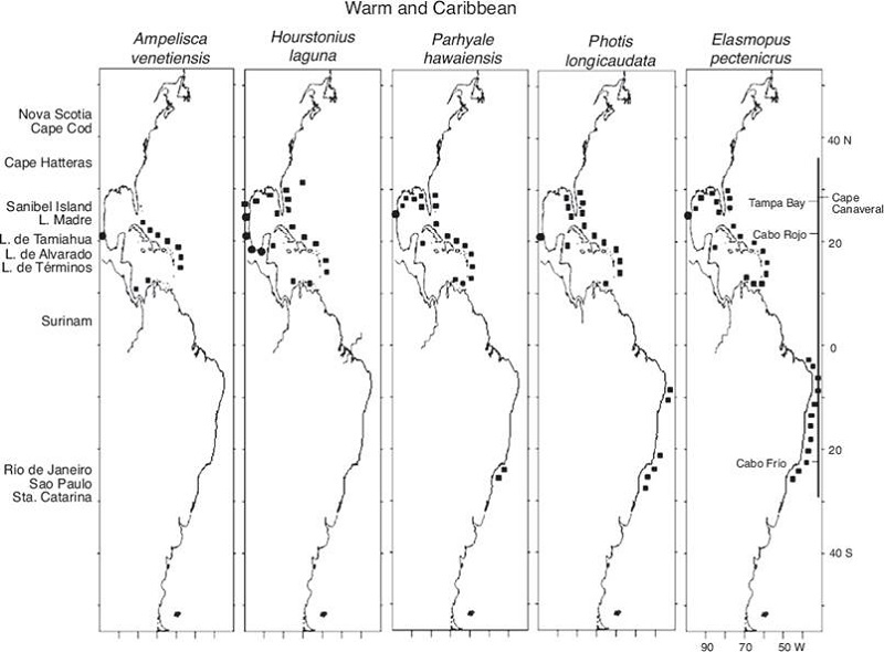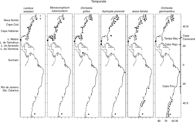 Among the 6 temperate species (Fig. 7), Lembos websteri Bate, 1857, Monocorophium tuberculatum (Shoemaker, 1934) and O. grillus are distributed from Maine to eastern Florida and in the Gulf of Mexico. L. websteri also has records in an extremely northerly point in Greenland, while O. grillus extends northwards to the Newfoundland coast and southwards to Colombia (this last point is considered an isolated record). M. tuberculatum is included in this group in spite of having 1 record in Florida Bay, in consideration of its clearly northern affinity and its absence from typically tropical habitats such as Laguna de Términos, Campeche where Ledoyer (1986) and Corona et al. (2000) did not record it in spite of thorough sampling. These species present a disjunct distribution at the tip of Florida where ocean water masses are more characteristically tropical, as is the case of the Carolinian zoogeographic province (Thurman, 1987).