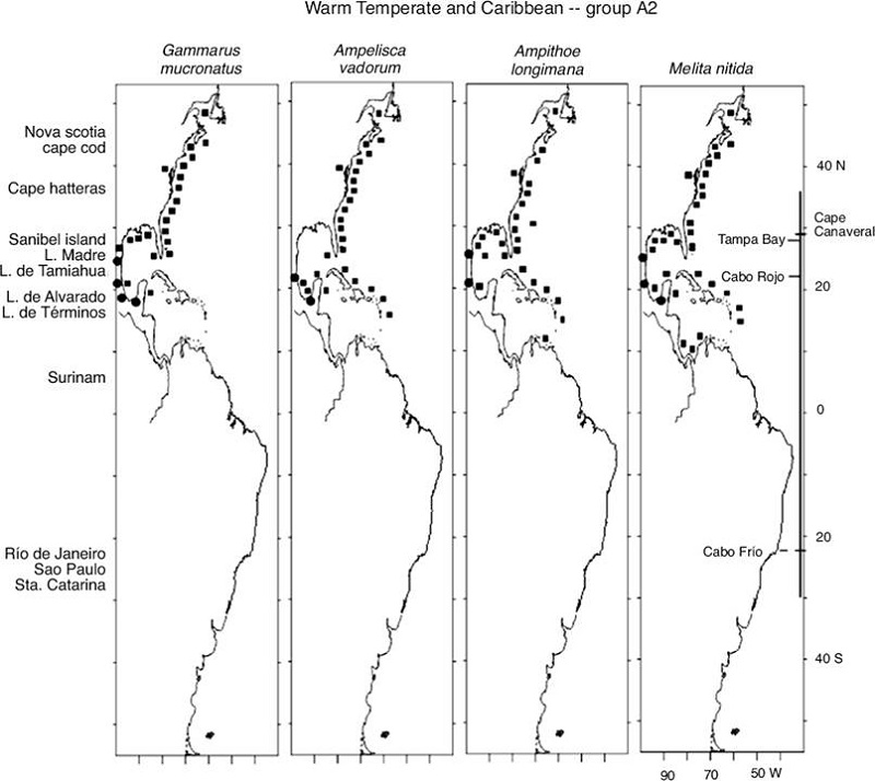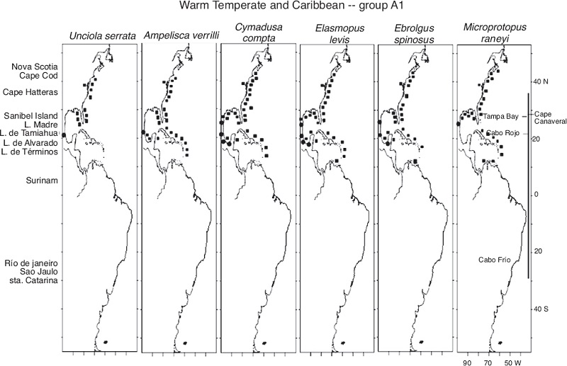 The 18 Warm Temperate and Caribbean species may be grouped into 5 sub-groups. Six species in group A1, Unciola serrata Shoemaker, 1945, Ampelisca verrilli Mills, 1967, C. compta, E. levis, E. spinosus and Microprotopus raneyi Wigley, 1966, present a mostly continuous distribution from Maine, south along the eastern coast of the United States, the Gulf of Mexico and throughout the Caribbean Sea (except for U. serrata which at present has no records in the Caribbean) (Fig. 3). The species in proup A2 follow the same distribution but include temperate habitats in Nova Scotia and a northernmost point in the Gulf of St Lawrence, Canada. These are G. mucronatus, A. vadorum, A. longimana and M. nitida. It is interesting to note that G. mucronatus has 1 single record in the Caribbean, in Quintana Roo, Mexico (Fig. 4).