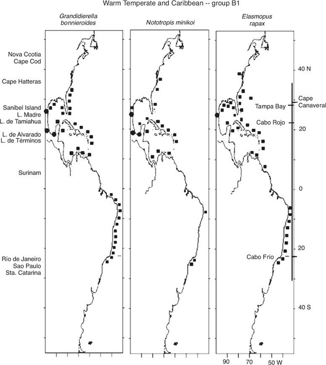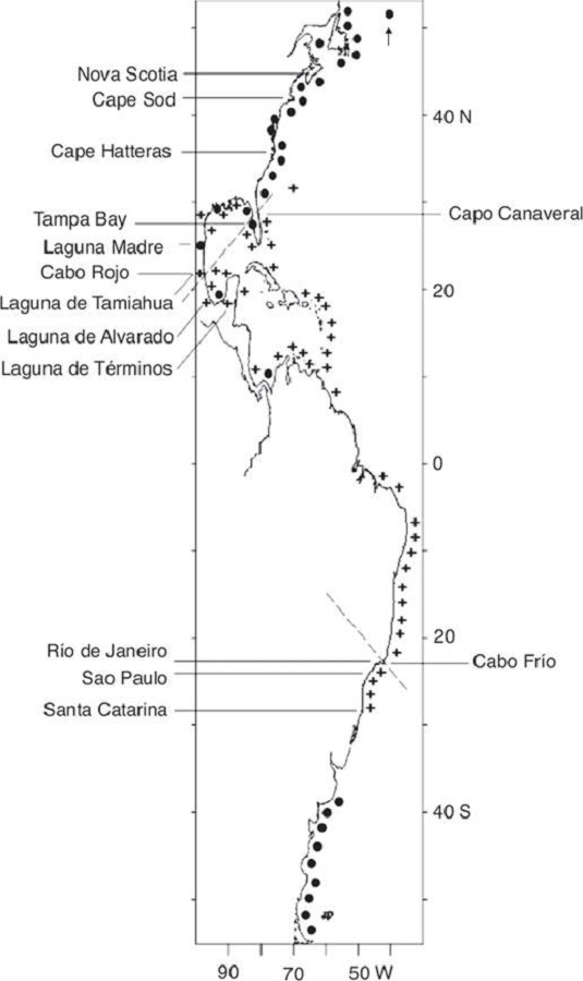 A map of the Western Atlantic including the important zoogeographic landmarks of Cape Cod, Cape Hatteras, Cape Canaveral and Tampa Bay in the United States, Cabo Rojo in Mexico, and Cabo Frío in Brazil, was prepared for each species considering the published data on the geographic distribution of each species (the geographic localities and the authors that reported them for each species are presented in Appendix 1), as well as the updated records for Laguna Madre and Laguna de Tamiahua. The Primer v.6 programme (Clarke & Gorley, 2006) was used to analyse a presence-absence matrix for species-geographic localities, and group geographic points according to Pearson's average linkage correlation to form clusters. A cluster analysis to group species provided no clear pattern.