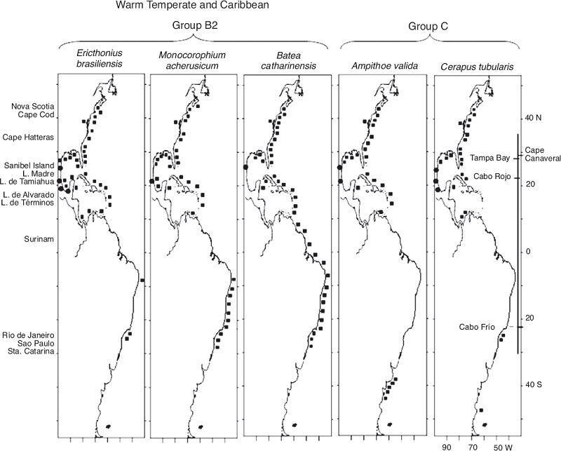 The species in group B1 are distributed along the southern half of the eastern coast of the United States, the Gulf of Mexico, the Caribbean Sea and the coast of Brazil, and include Grandidierella bonnieroidesStephensen, 1948, N. minikoi and Elasmopus rapax Costa, 1853 (Fig. 5). In particular, regarding G. bonnieroides, Myers (1970) reviewed its status and stated that specimens collected in the Gulf of Mexico, Caribbean Sea, Colombia, Venezuela, and Trinidad corresponded to this species. Asari and Myers (1982) later observed variations in specimens collected in the Western Atlantic and concluded that a complex of species was present. However, the 55 specimens from Laguna Madre were identified by A. Corona (pers comm), an expert in amphipod taxonomy, leaving no doubt as to the identity of the species. Three of the Warm Temperate and Caribbean species, C. compta, A. longimana and E. rapax, have also been recorded in Bermuda. The species in group B2, E. brasiliensis, M. acherusicum and B. catharinensis, have the same distribution but extend northwards to Nova Scotia (Fig. 6). The coastline between Venezuela and Brazil with no records in the case of some species most probably indicates a lack of studies throughout the area rather than a disjunct distribution of the species.